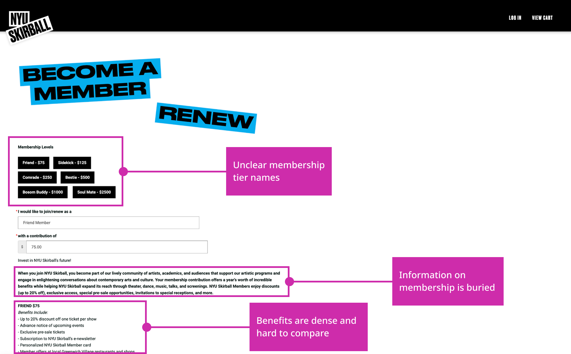 The problem: There is a lack of information about membership throughout the ticketing process, meaning that users don't have enough information to prompt them to actually become a member.