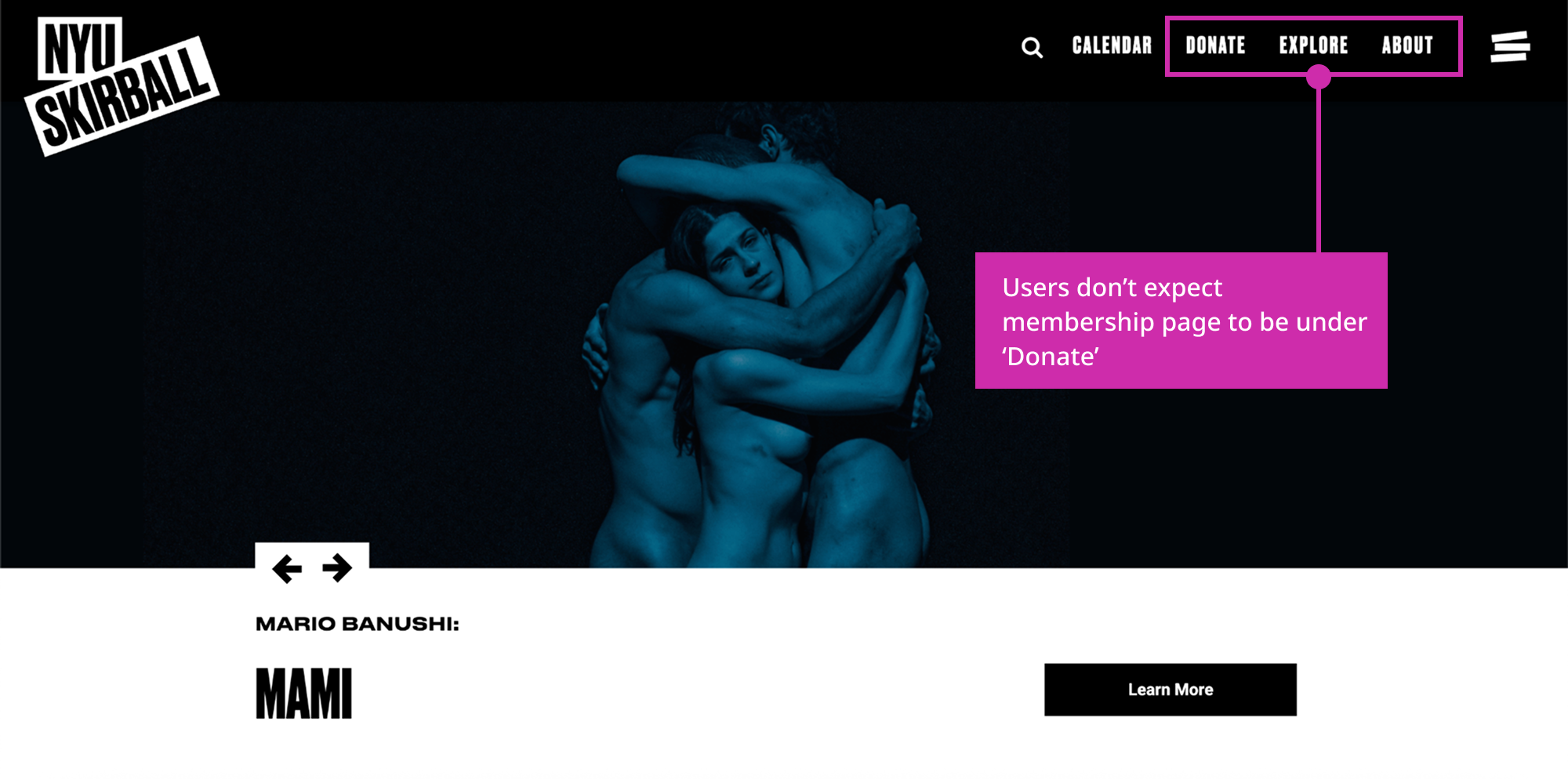 The problem: Users don't initially think that the membership page would be under the 'Donate' navigation item, so they navigate to 'Explore' or 'About' first before finding it under 'Donate'.